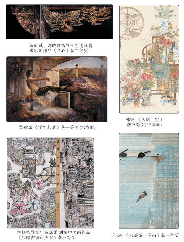 在最终的奖项角逐中,我系师生不负众望,进入复评的作品全部获奖。在高校教师组中,黄斌斌老师水彩画创作《浮生若梦》荣获一等奖,林畅老师的国画创作《久居兰室》荣获三等奖,许晓虹老师的版画创作《逍遥游·图南》荣获三等奖。而在高校学生组中,面对众多高校专业类学生的激烈竞争,黄斌斌、许晓虹两位老师共同指导的学生水彩画创作《匠心》和林畅老师指导的学生国画创作《晨曦古镇市声喧》也在众多参赛作品中脱颖而出,充分展现了他们的艺术才华和创作潜力,最终分别荣获二、三等奖。