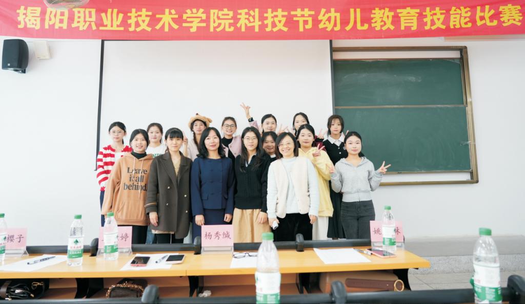 出席本次比赛的评委老师有揭阳市立德幼儿园园长杨秀缄、师范教育系学前教研室主任王佳婷老师、学前教研室吴樱子老师、姚梦琳老师等。此次比赛共有10组选手晋级决赛,经过选手激烈的逐角,评委老师评出一等奖1组,二等奖2组,三等奖3组,学前教育专业2023级陈怡婷、吴银链同学获得一等奖。