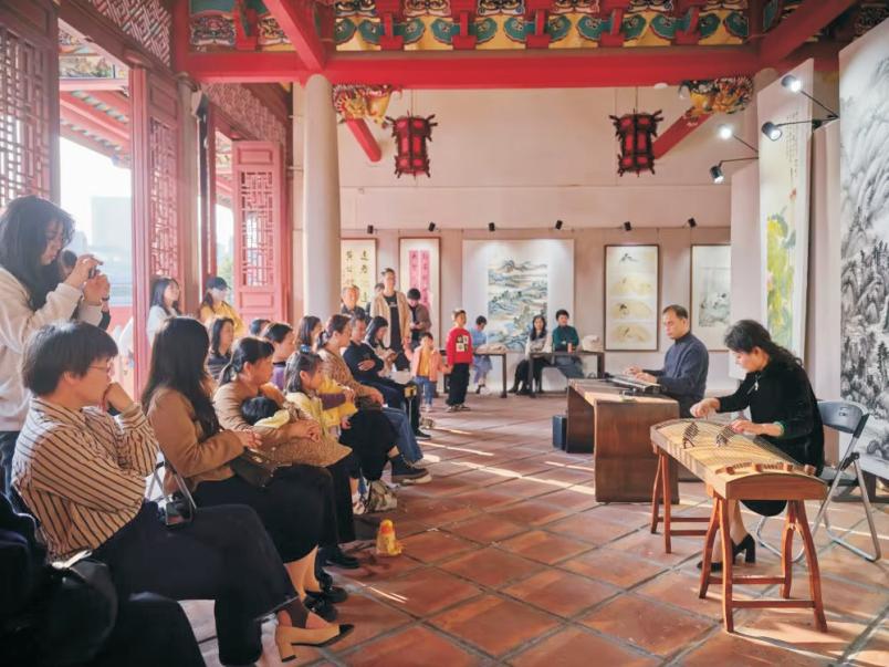 开幕式活动当晚,林锐翰老师作为古琴艺术(揭阳)非物质文化遗产代表性传承人、广东省潮汕琴会会长,带领其学子们为观众带来了一场视听盛宴。现场演奏的曲目既有传统名曲《关山月》《平沙落雁》,也有现代创作《卧龙吟》等。