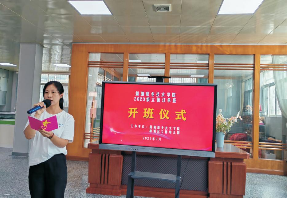 开班仪式于2024年9月26日下午在榕城区立德幼儿园会议室隆重举行。我系出席开班仪式的有师范教育系主任黄英铭、学前教育教研室主任王佳婷、专任教师张雅茹、学前教育专业群负责人黄春梅、2023级订单班全体学生;立德幼儿园出席仪式的有幼儿园园长陈少丽、园长助理及相关教师。仪式由立德幼儿园园长助理主持。