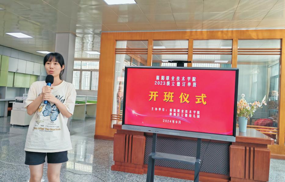 仪式上,学前教育专业群负责人黄春梅老师介绍了订单班的基本情况,包括双方筹备、方案制订、人员遴选、机制完善等。她认为,立德订单班是学前教育专业群深化产教融合、创新人才培养模式的重要举措,订单班不仅能够培养学生的实践能力,还能为企业提供符合岗位需求的高素质人才,实现双赢。