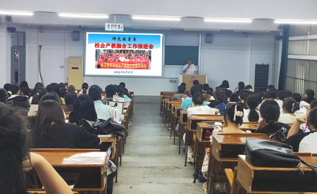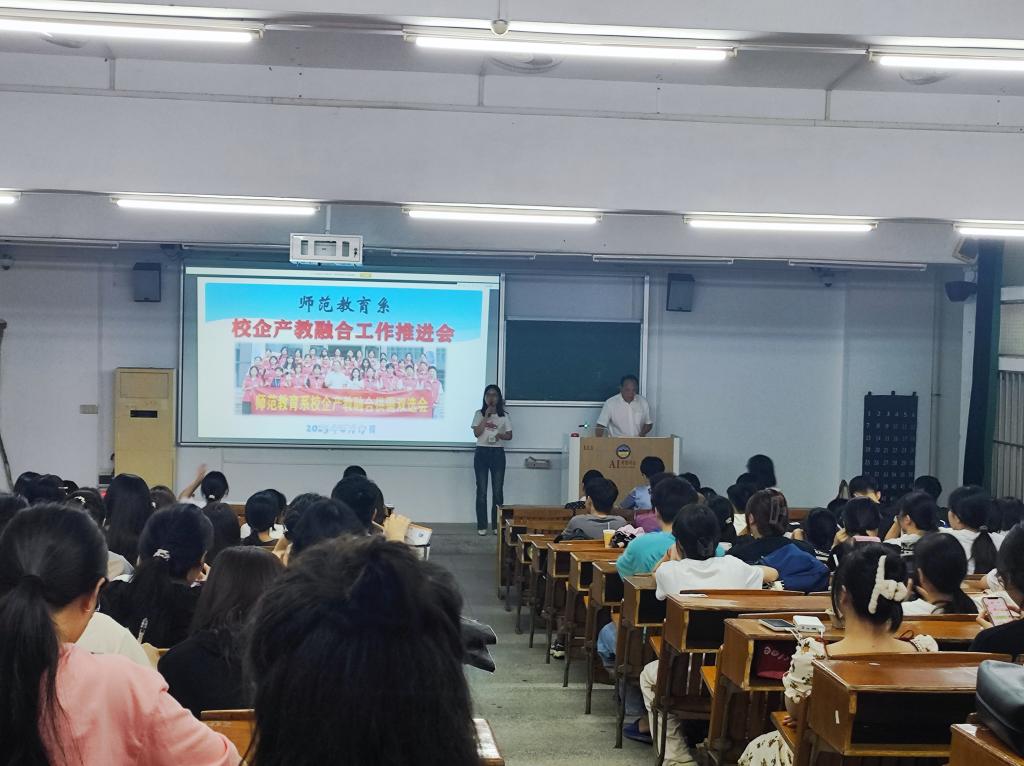 为进一步深化学校“2+0.5+0.5”产教融合人才培养改革,6月17日,师范教育系在教学楼召开2023级学生校企产教融合动员大会。系主任黄英铭、各班级班主任及2023级250多名学生参加了会议,会议由年级辅导员孙乐红老师主持。