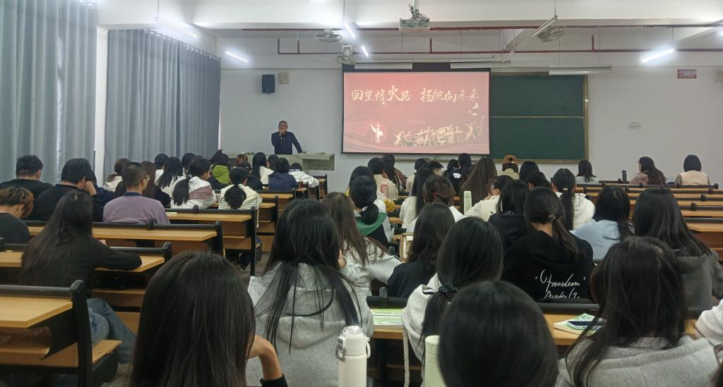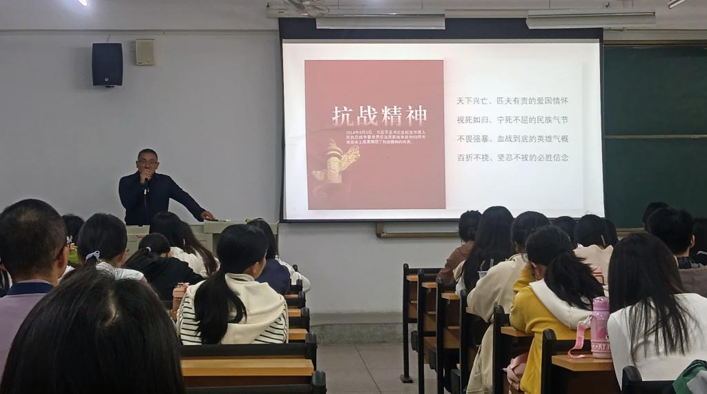 师范教育系总支书记李勇以9月3日纪念中国人民抗日战争暨世界反法西斯战争胜利80周年大会引入主题,带领同学们回望了1931—1945年中国人民用生命与鲜血谱写的反抗外来侵略的悲壮历史,重温了一个个可歌可泣的英雄故事,并学习领会“天下兴亡、匹夫有责的爱国情怀,视死如归、宁死不屈的民族气节,不畏强暴、血战到底的英雄气概,百折不挠、坚忍不拔的必胜信念”这一习近平总书记在纪念中国人民抗日战争暨世界反法西斯战争胜利69周年座谈会上高度概括出的抗战精神的深刻内涵。在“扬帆向未来”部分,带领同学们了解新中国成立后中国共产党领导全国各族人民取得的辉煌成就,并激励广大青年学生要不忘历史,学习先烈精神,不负先烈期盼,牢牢把握住三年宝贵的大学时光,学会自律,学会学习,学会生活,为实现中国式现代化贡献自己的力量。