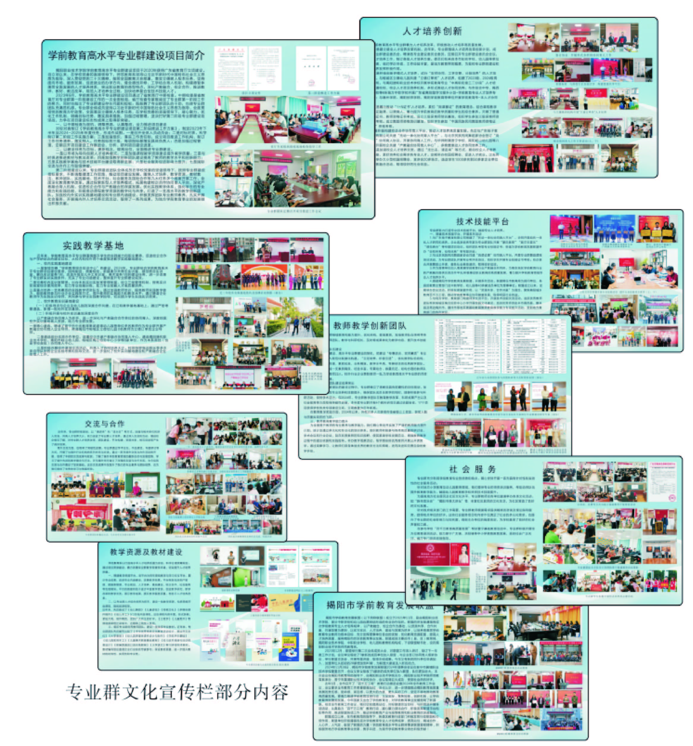 长廊的主体部分,聚焦“学前教育高水平专业群建设成果展”。该板块精心设计,内容按照专业群建设的九大核心任务指标进行模块化呈现。这九大模块分别涵盖了人才培养模式创新、课程教学资源建设、教材与教法改革、教师教学创新团队、实践教学基地、技术技能平台、社会服务能力、国际交流合作以及可持续发展机制等关键领域。每一模块都通过简练的文字说明、详实的数据图表、生动的活动照片以及代表性的成果作品进行立体化展示,内容丰富,案例典型,逻辑清晰,表述严谨,图文相得益彰,一目了然。