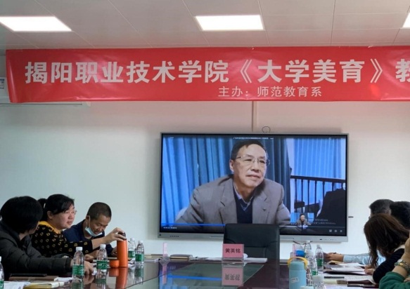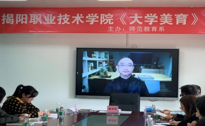 广东外语外贸大学原艺术学院院长李于昆教授首先祝贺揭阳职业技术学院《大学美育》教材研讨会召开。他说:包括“大学美育”在内的公共艺术课程是我国高等教育课程体系的重要组成部分,是学校艺术教育工作的中心环节,是实施美育的主要途径,具有很强的意识形态属性,对于引导学生树立正确的历史观、民族观、国家观、文化观,提高学生的审美和人文素养,培养创新精神和实践能力,塑造健全人格,具有不可替代的价值和作用。建议揭阳职院打造“三高工程”:一是高起点,精准定位:面向高职教育的大学美育课程;二是高品质,核心素养:审美感知、艺术表现、创意实践、文化理解。三是高质量,在现有基础上,瞄准国家规划教材的申报标准编写教材,打造美育名师工作室,挖掘粤东地方文化进教材,组织召开全省高职院校公共艺术课程研讨会,树立品牌,扩大影响,持续推进公共艺术课程建设,将揭阳职业技术学院打造为全省公共艺术教育的职业院校示范校。