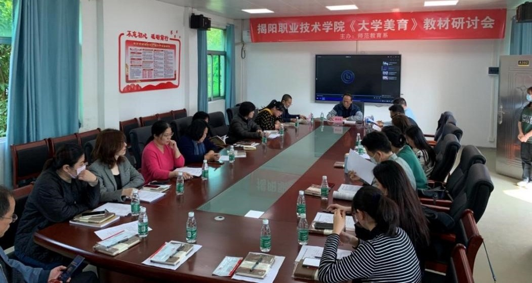 大学美育课程是我校学前教育高水平专业群课程群重要的组成部分。为深入开展美育育人工作,由师范教育系主持编写的《大学美育》已于2022 年 8 月由清华大学出版社出版并投入使用。2022年12月8日,师范教育系在系办会议室主持召开了《大学美育》教材研讨会。广州美术学院陈海宁教授、广东外语外贸大学艺术学院原院长李于昆教授、惠州学院教务处副处长兼美育中心主任罗晓敏以视频方式出席了研讨会,会议由学前教育高水平专业群负责人、师范教育系主任李汉潮主持。《大学美育》主编、参编黄斌斌、吴樱子等老师及任教《大学美育》教师参加了研讨会。