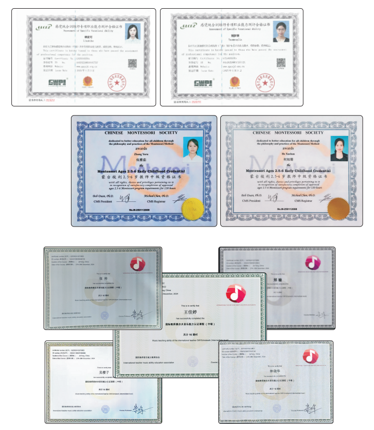 老师们通过认真学习,参与行业考核,获得了相应科目专业资格证书。通过本次培训,教师们不仅对感觉统合、蒙氏和奥尔夫音乐等教学法有了更深入的理解和掌握,也进一步更新了教育观念,提升了教学技能。参训教师们纷纷表示,将把所学知识和技能运用到实际教学中,不断创新教学方法,提高教学质量,为培养更多优秀的师范人才贡献自己的力量。
