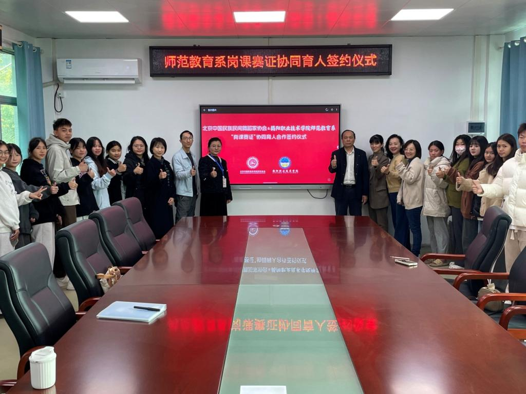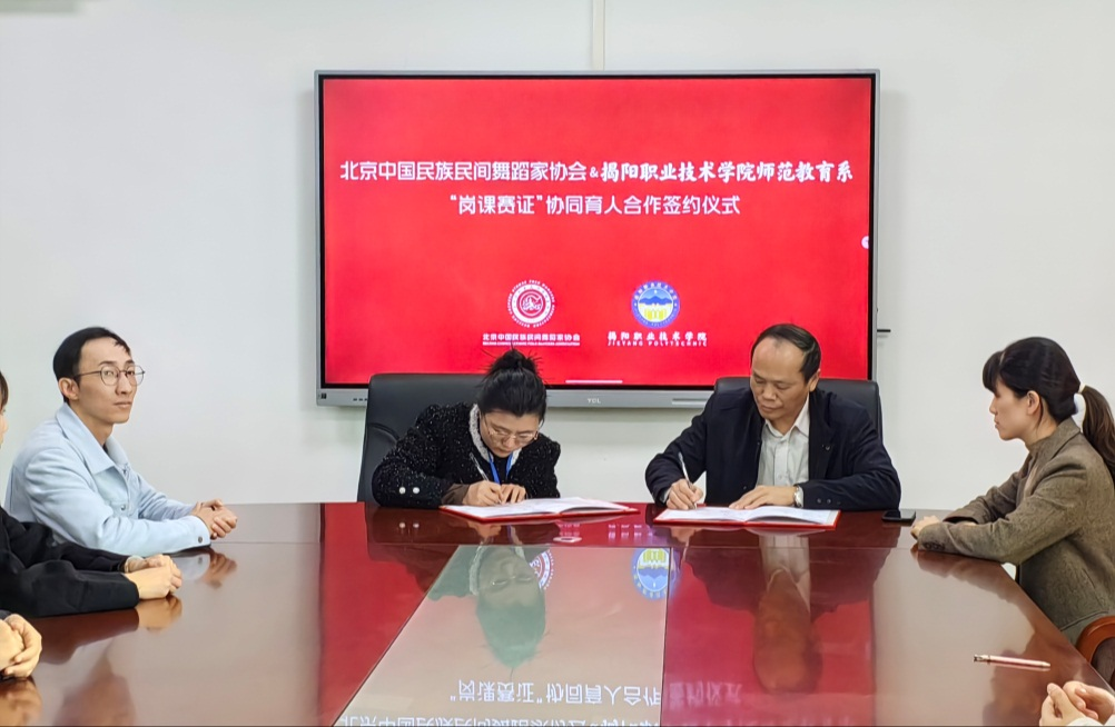 2023年12月26日上午,我系与北京中国民族民间舞蹈家协会在系实训中心三楼会议室举行了”岗课赛证”协同育人合作签约仪式。师范教育系系主任黄英铭、北京中国民族民间舞蹈家协会代表罗淼盼老师一行,以及我系学前教育专业教师代表出席了签约仪式。