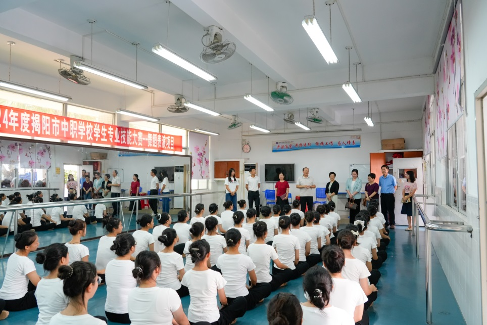 随后,两校领导共同前往舞蹈室,看望正在排练舞蹈节目的2025级幼儿保育专业中高职“三二分段”全体学生。2025年,我校学前教育专业对接中职幼儿保育专业,开展中高职贯通人才培养,共招生50名,报到50名,报到率100%。这批学生三年后将转段到我校学前教育专业学习。黄主任首先祝贺同学们顺利录取到中高职贯通班学习,他分析了职业教育发展的广阔前景,鼓励同学们坚定选择,努力学好专业技能,为未来成长为“师德高尚、业务精湛”的卓越幼师奠定坚实基础,期待未来转段到高职学习。捷和职校党总支书记林丽娜对学生们的成长与进步给予充分肯定,勉励学生既要学好文化基础知识,又要练就过硬本领,养成良好的职业素养。两校领导的殷切期望与真诚关怀,赢得了全场阵阵掌声,深深激励了在座的每一位学子。