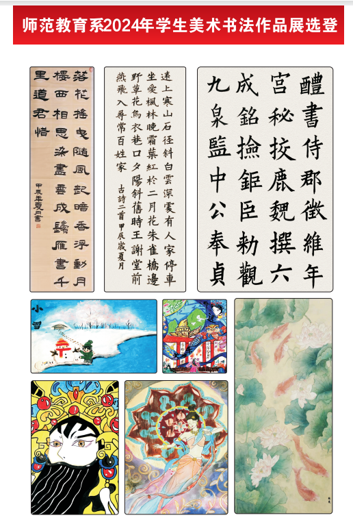 本次书法美术作品展为师范生提供一个展示才华的平台,在主办单位的精心策划与组织下成功吸引了众多师生参与,极大地激发师生们对传统文化的热爱与创新精神。同学们表示,期待未来能够举办更多类似的活动,为弘扬中华优秀传统文化搭建更好的舞台。部分作品见下图——“师范教育系2024年学生美术书法作品展选登”。