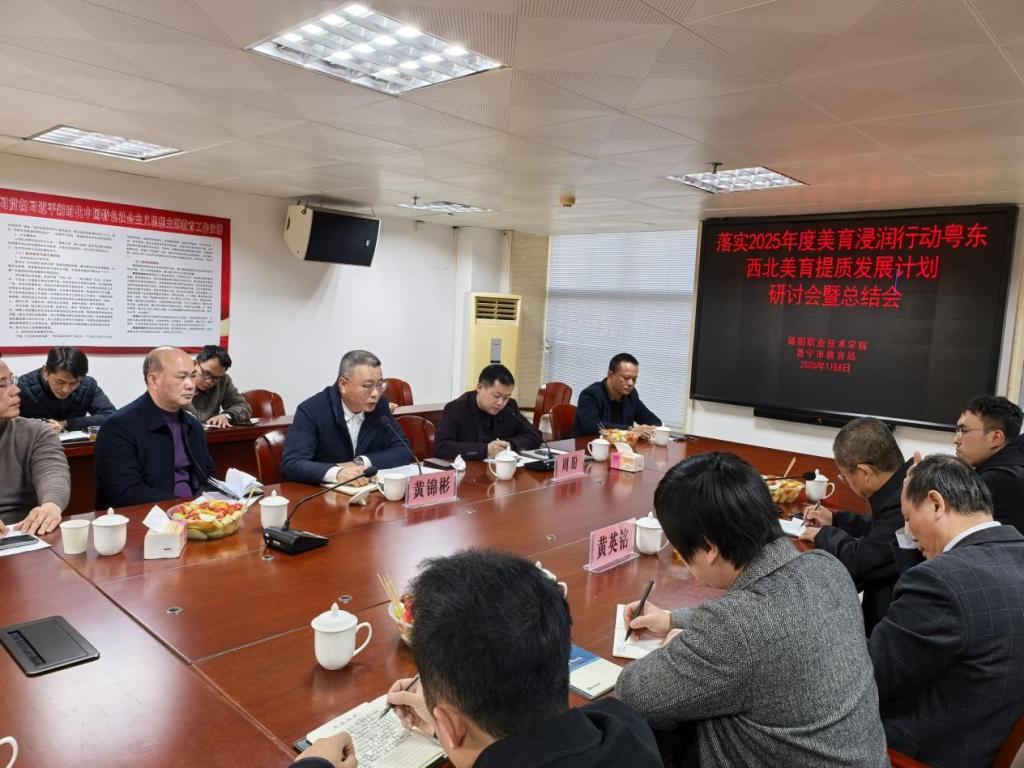 为全面总结2025年度美育浸润行动工作成效,凝聚共识、谋划未来,2026年1月8日,揭阳职业技术学院在普宁市教育局召开“落实2025年度美育浸润行动粤东西北美育提质发展计划”研讨会暨总结会。根据学院领导安排,师范教育系领导班子与美育发展中心专家团队出席活动。普宁市教育局及下属镇街教育组负责人、受帮扶学校校长、美育专家代表等共同参会,围绕美育浸润成果、存在问题及未来发展路径展开深入交流。