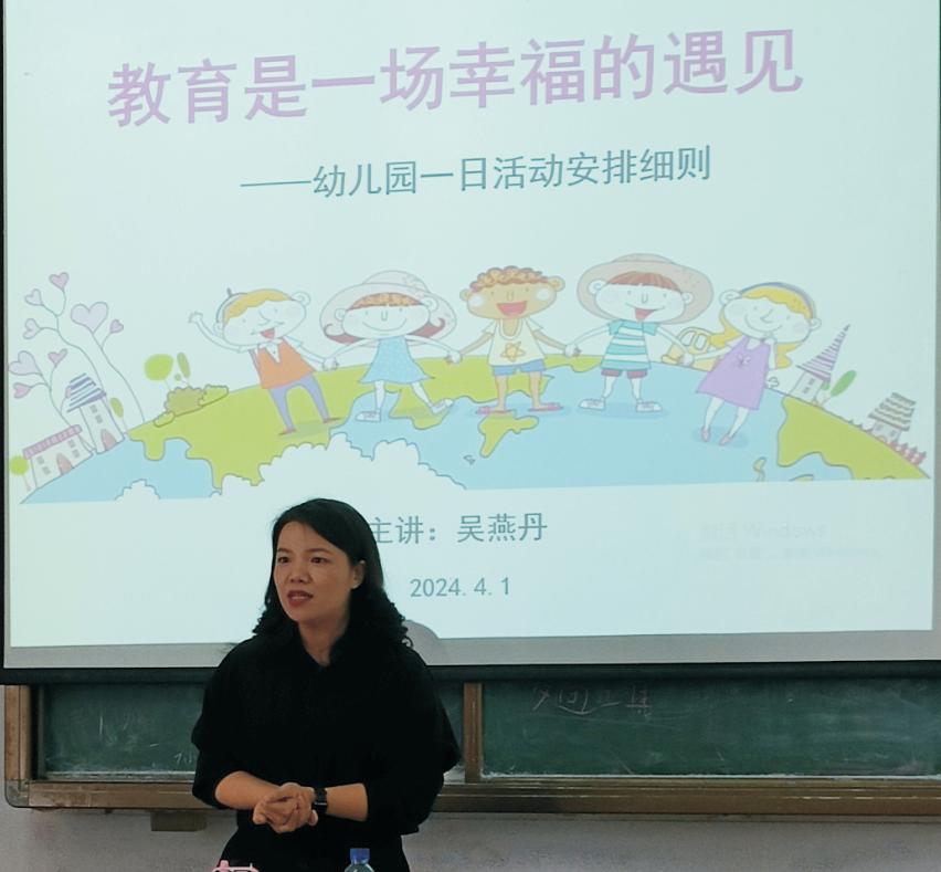 2024年4月1日下午,榕城区砲台镇明珠幼儿园园长吴燕丹应邀为我系学前教育学生举办了题为《教育是一场幸福的遇见——幼儿园一日活动安排细则》专题讲座。讲座在学校教学楼C405举行,由学前教育高水平专业群何旭珊老师主持。