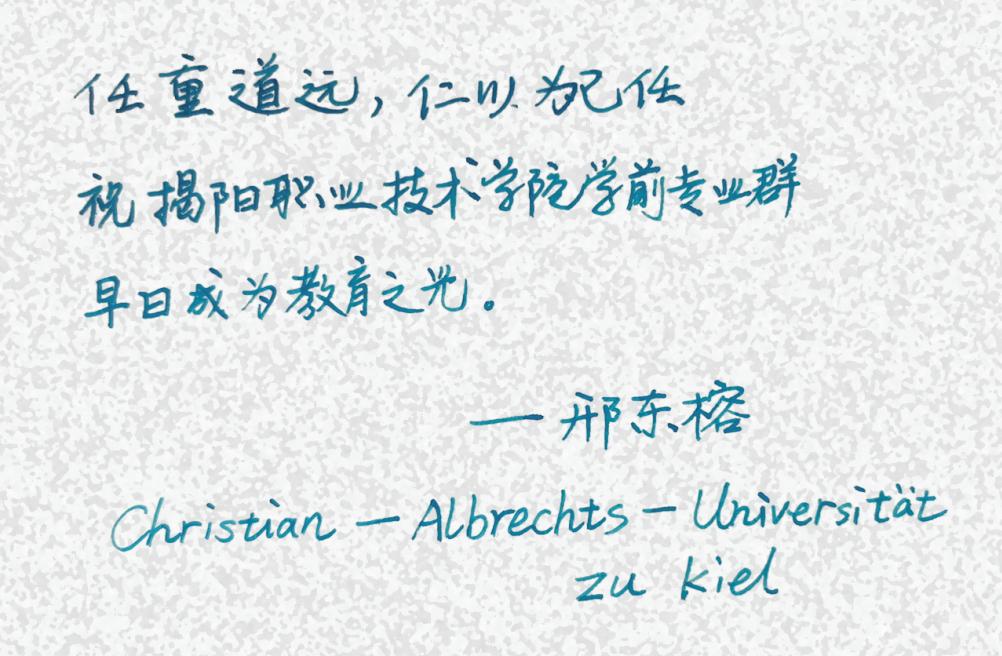 最后,我系向邢博士赠送了本系主办的《学前简讯》创刊号和几本国内专业书籍。邢博士也为我们题词:“任重道远,仁以为己任。祝揭阳职业技术学院学前专业群早日成为教育之光”。